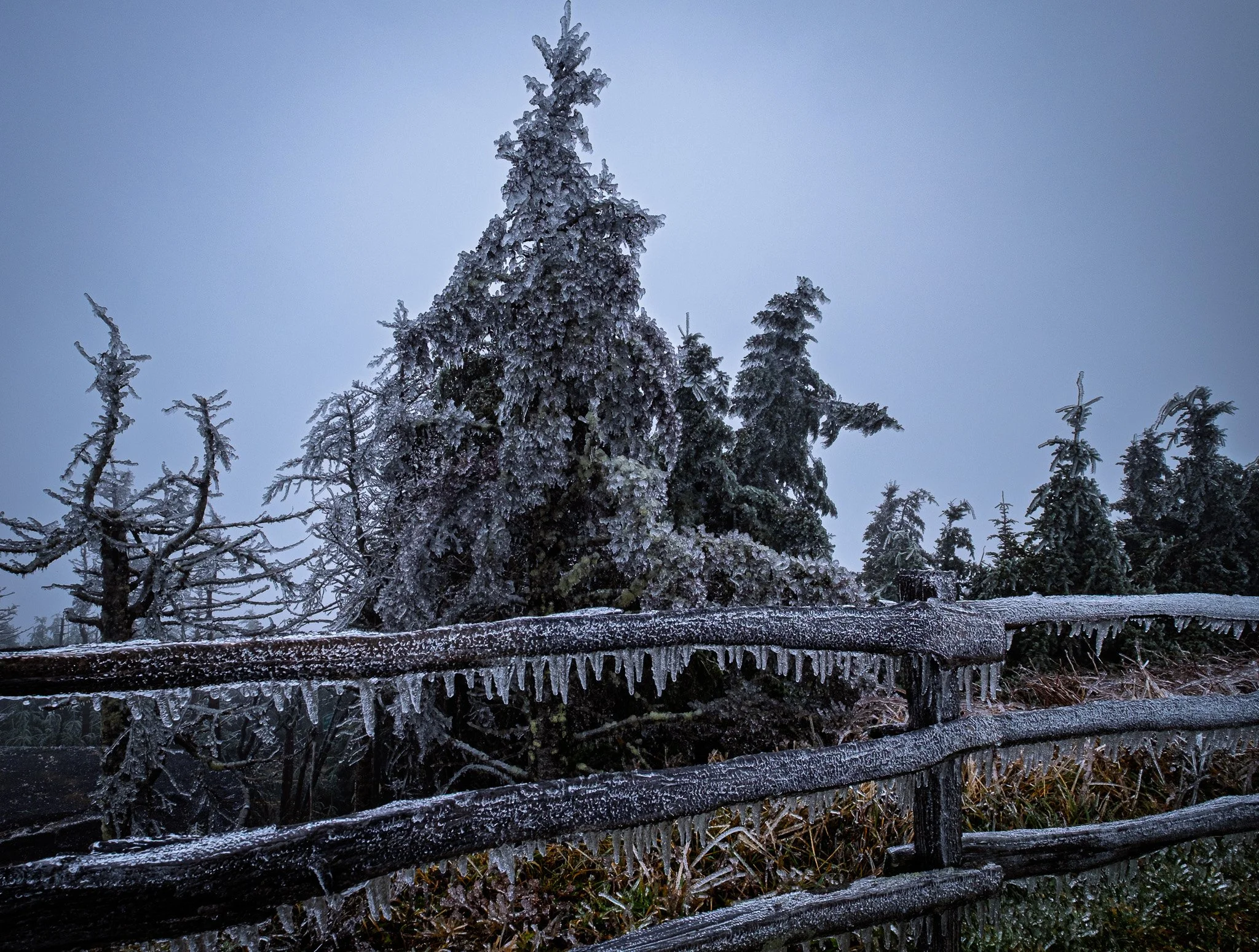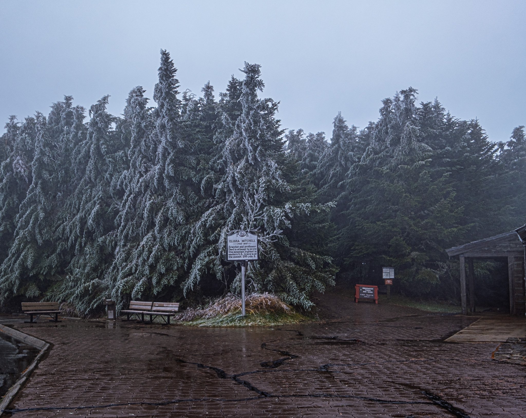 Scheduled to arrive in Asheville, NC today, we looked ahead and saw that the temperature was going to be a pleasant upper-50s in Asheville. Perfect, we figured, for a hike at the peak of Mount Mitchell State Park. However, as you can see here, Mother Nature had other plans!!