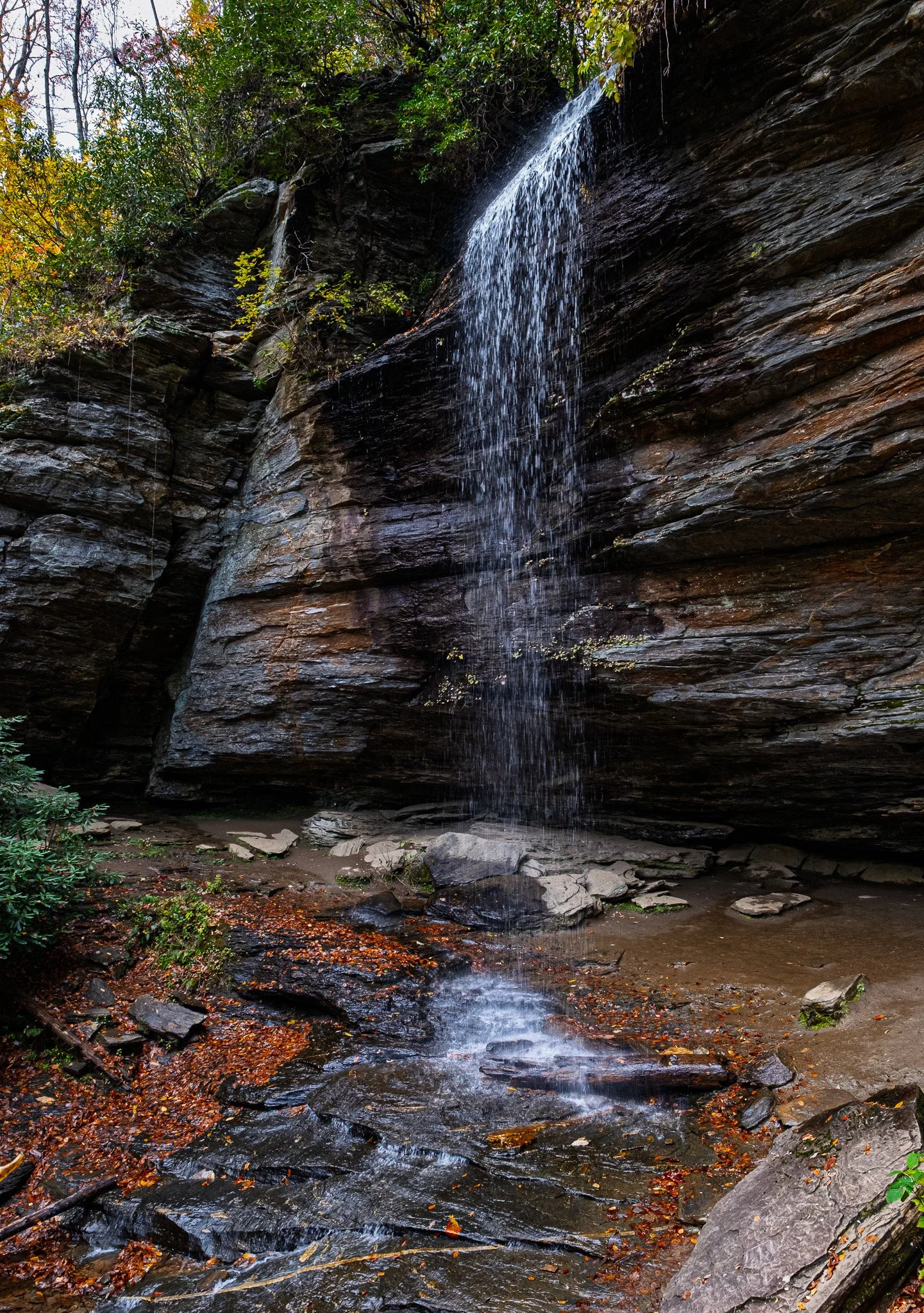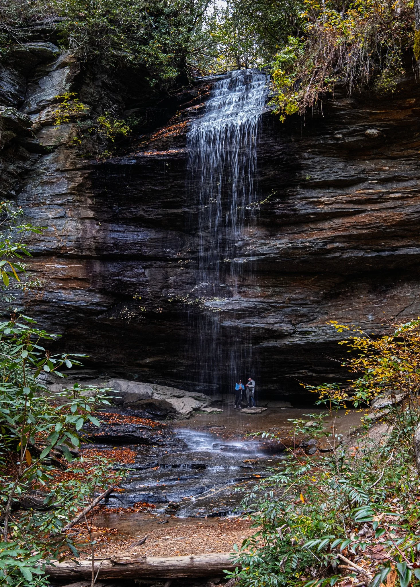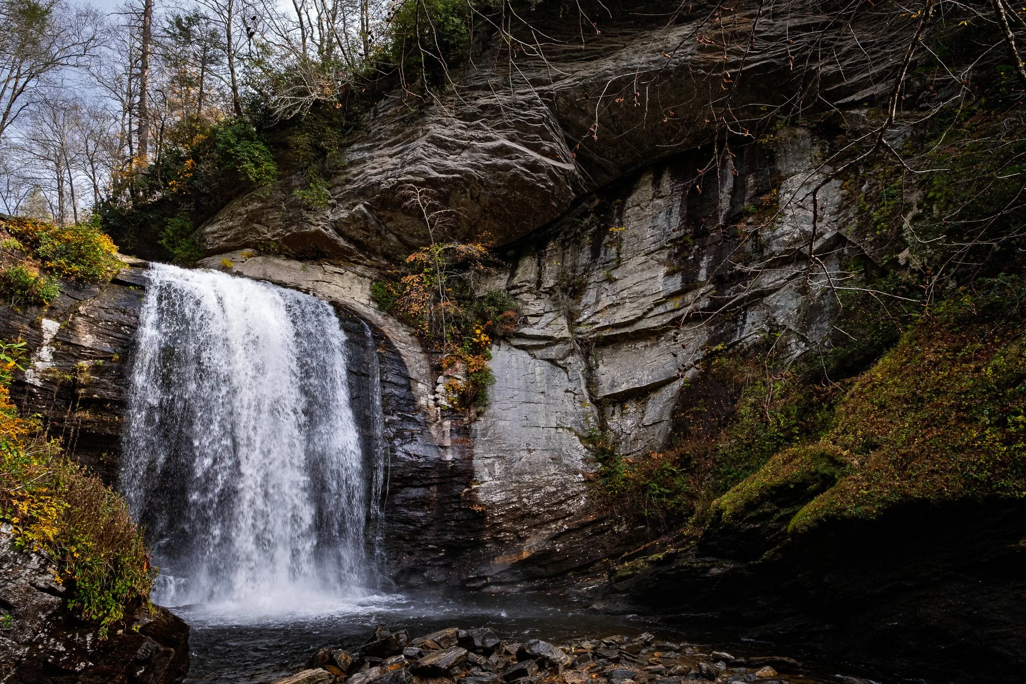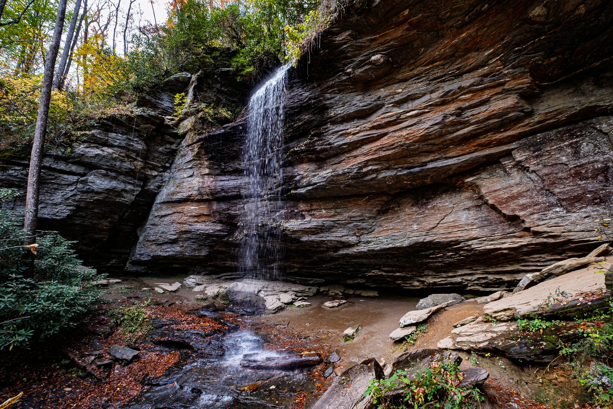 Moore Cove Falls is a picturesque 50-foot waterfall located just off the Pisgah Highway in western North Carolina. A short, easy 0.7-mile round-trip hike leads visitors through lush forest to the gently cascading falls. Unique for its shallow rock overhang, Moore Cove allows hikers to walk behind the curtain of water for a memorable Blue Ridge experience.