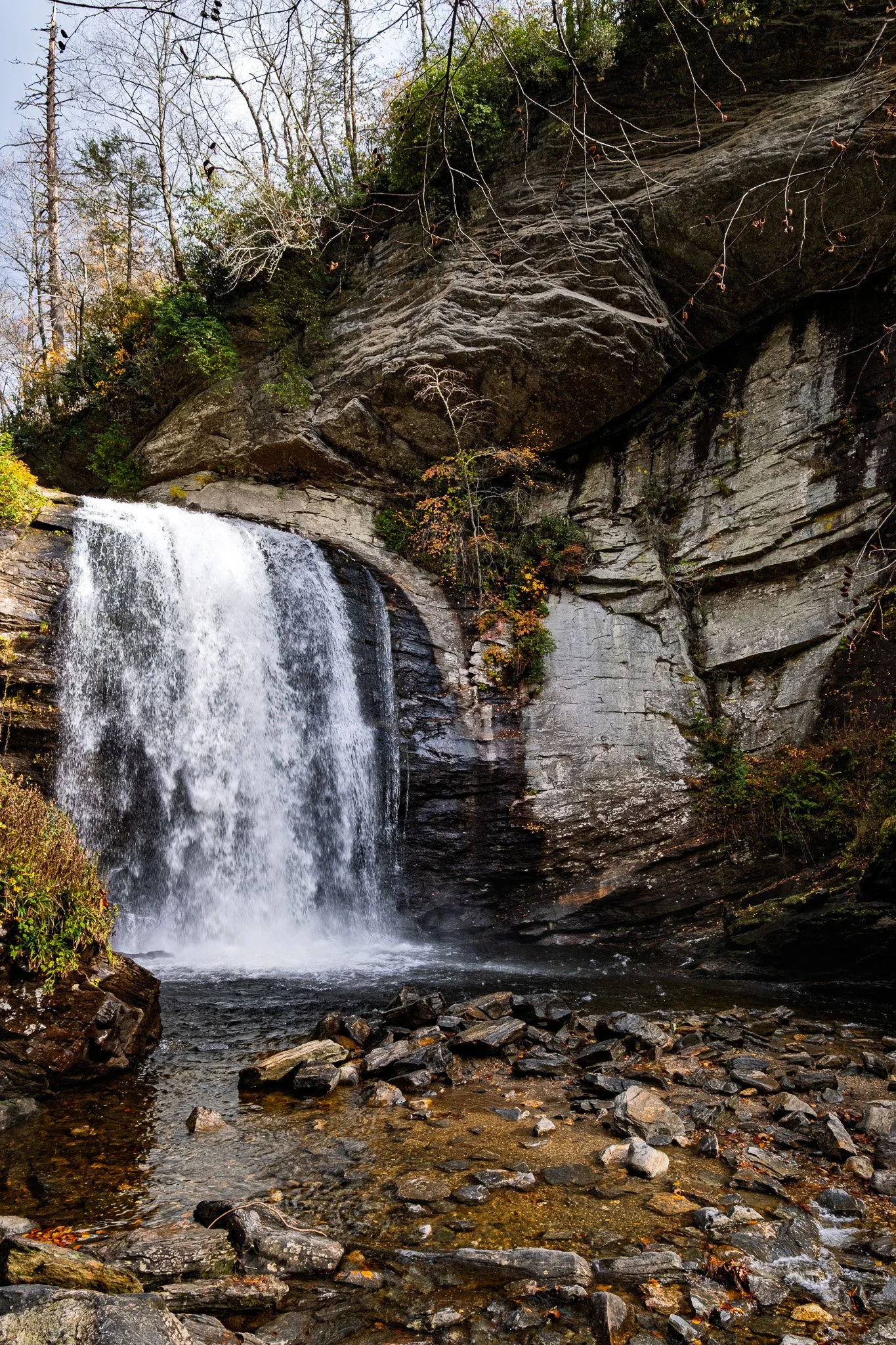 Looking Glass Falls is one of the most accessible and photographed waterfalls along the Pisgah Highway in western North Carolina. Plunging about 60 feet into a clear pool below, the falls are visible from the roadside, with stairs leading to the base. Its name comes from nearby Looking Glass Rock, which gleams like ice in winter.