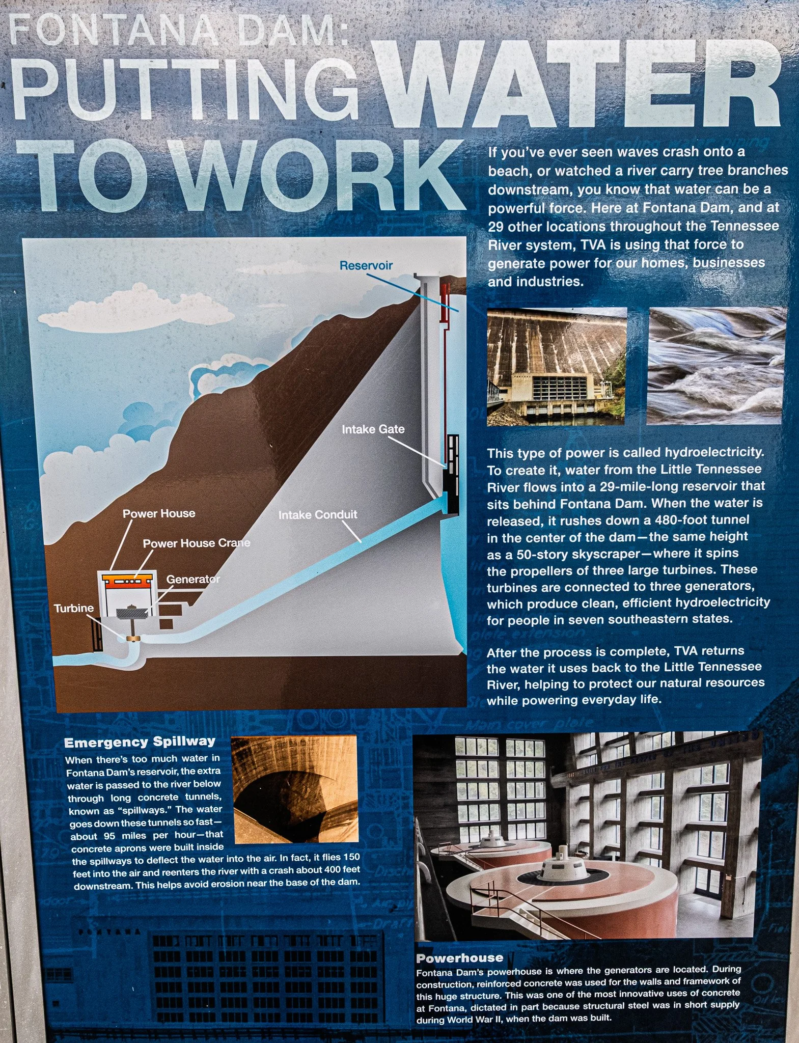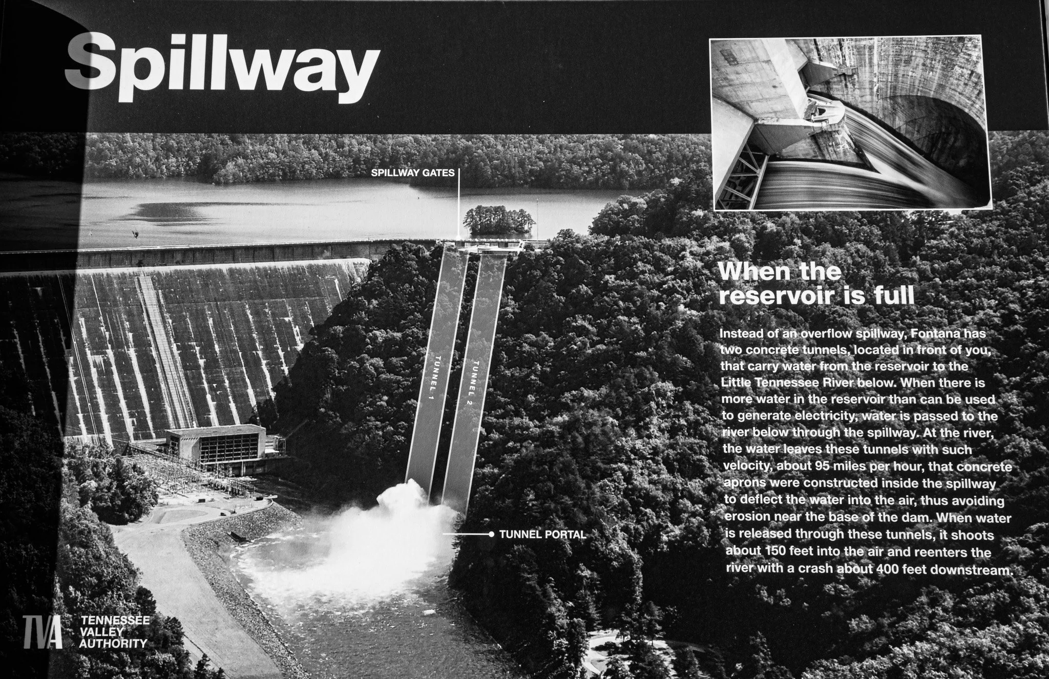 From an engineering standpoint, these spillways were fascinating. If you read the caption on the right, it is amazing to consider they had to line the bottom of these spillways with concrete bases to prevent the water from completely eroding the dam. How cool it would be to see the spray shoot up 150 feet when the water hits the bottom!