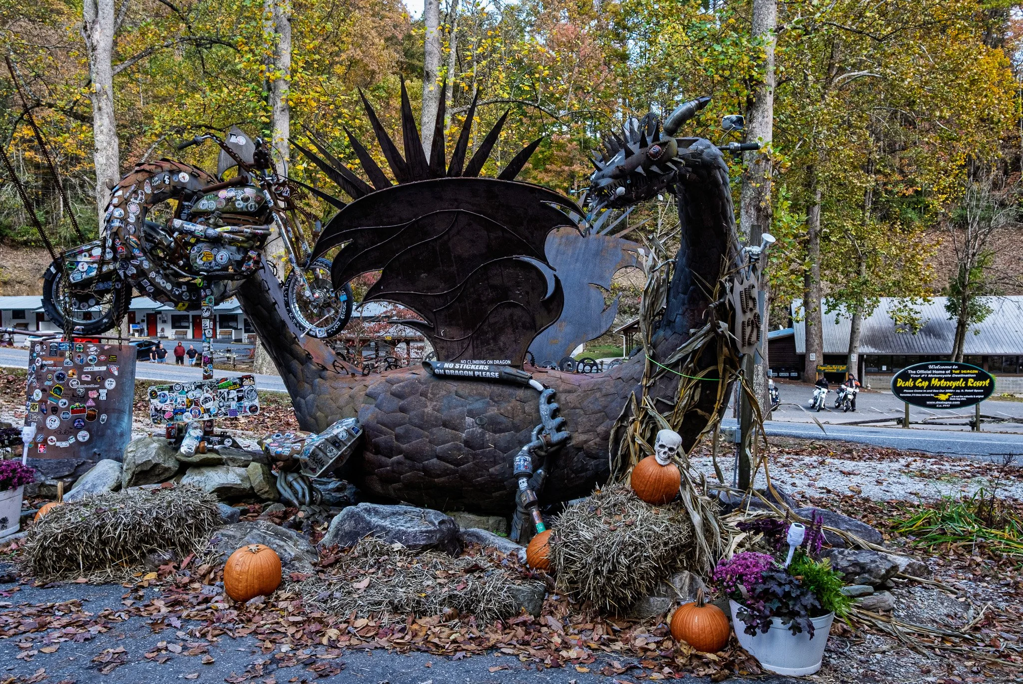 The Tree of Shame at Deals Gap is a quirky, unofficial landmark near the southern end of the Tail of the Dragon motorcycle route. It’s a tree-like display at the Deals Gap Motorcycle Resort adorned with broken bike parts and other wreckage from riders who didn’t quite conquer the Dragon’s famous curves. It serves as a playful yet stark reminder of the road’s difficulty.