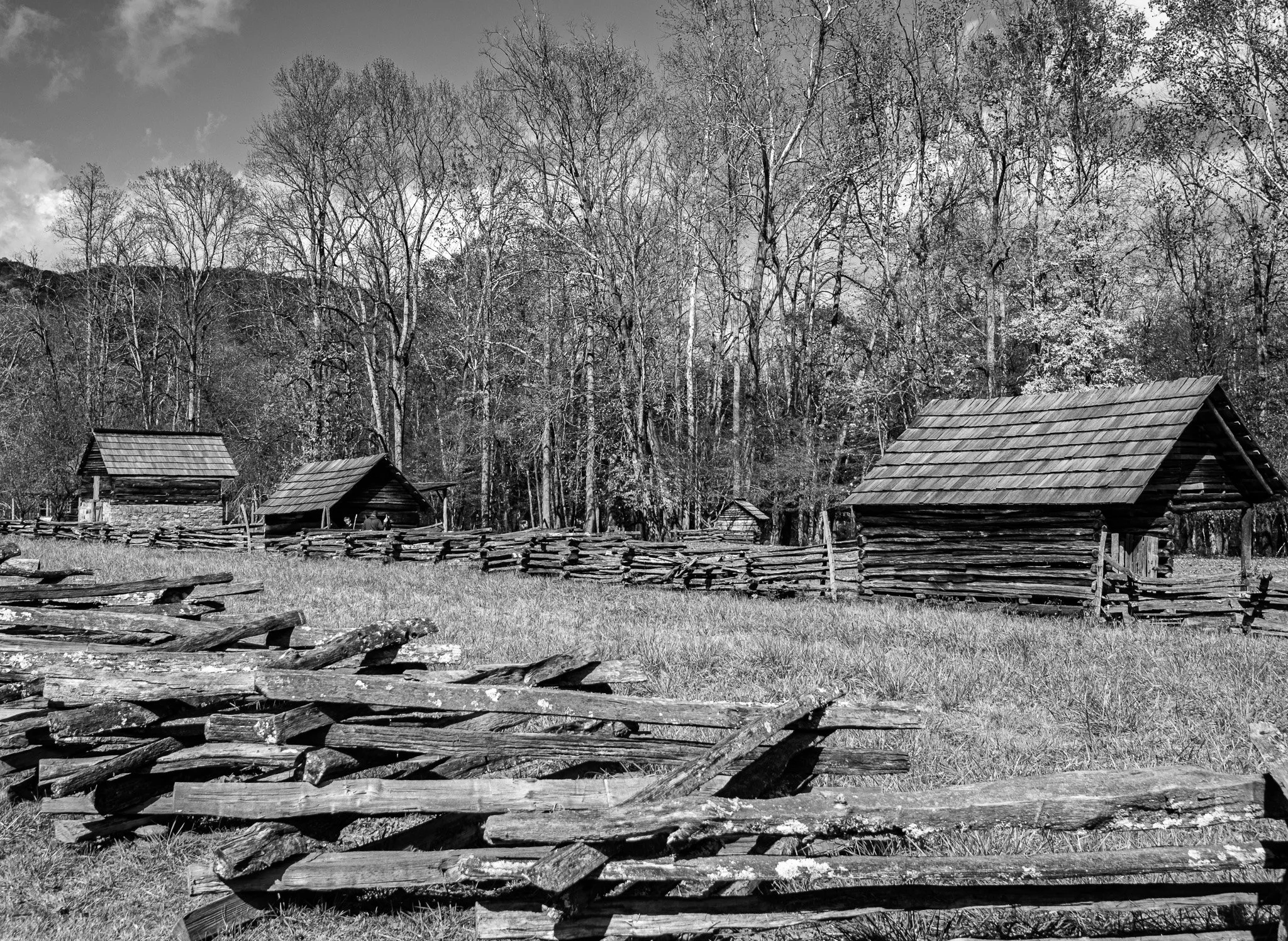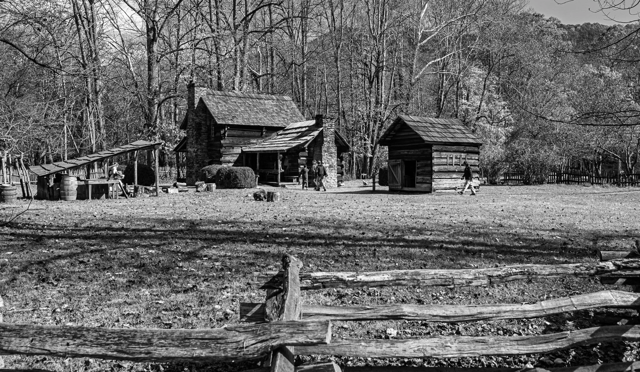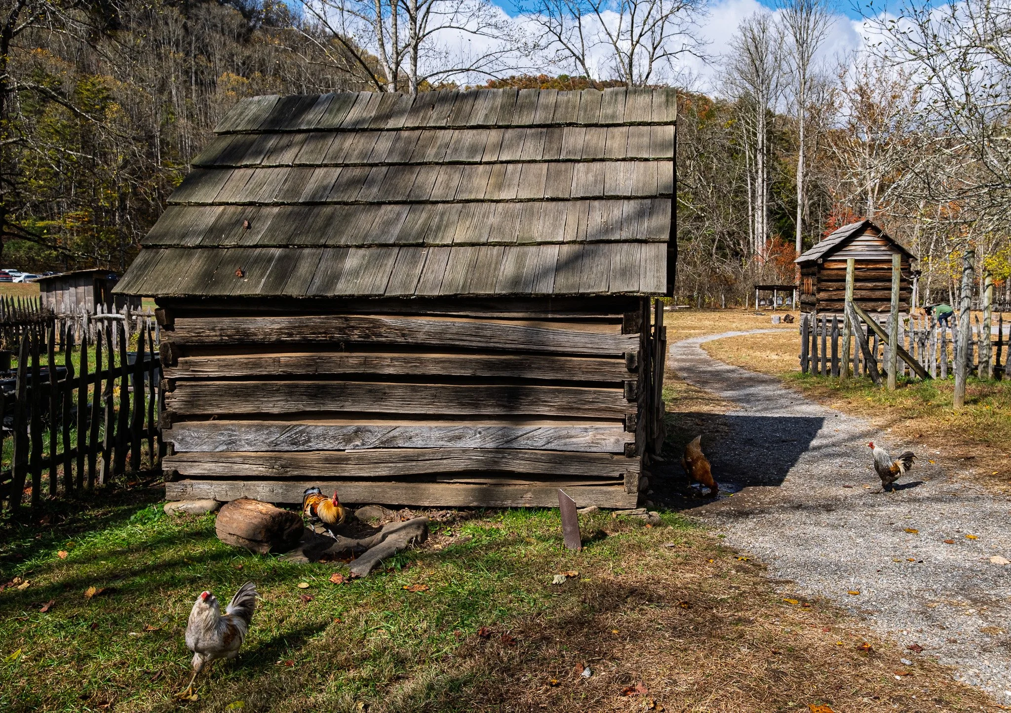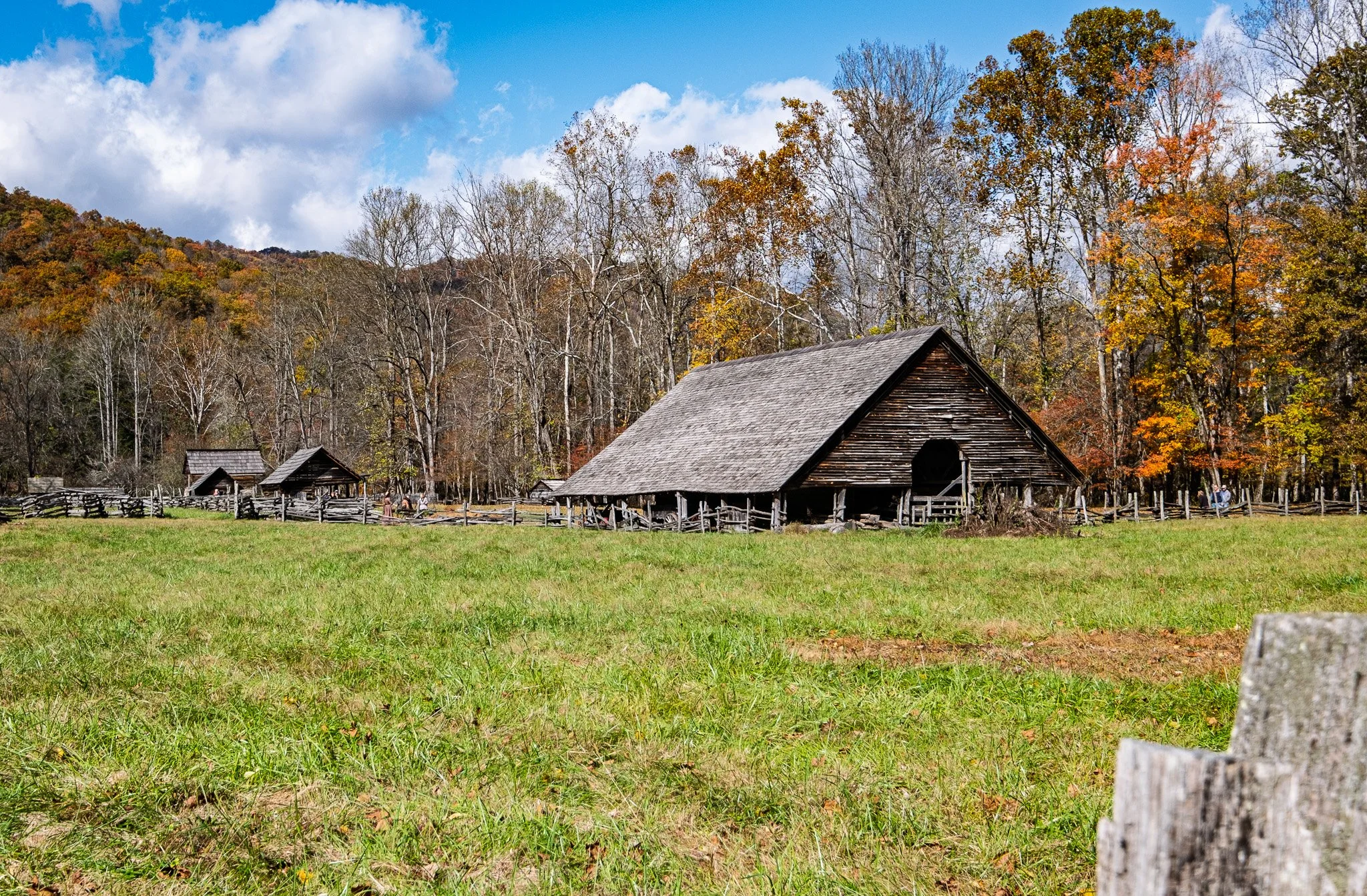 The Oconaluftee Mountain Farm Museum in Cherokee, North Carolina is an open-air historic site behind the Oconaluftee Visitor Center that recreates a late-19th-century Appalachian farm. It features authentic log buildings like the Davis House, barn, apple house, springhouse, and blacksmith shop relocated from across the park, showing how mountain families lived, farmed, and worked over a century ago.
