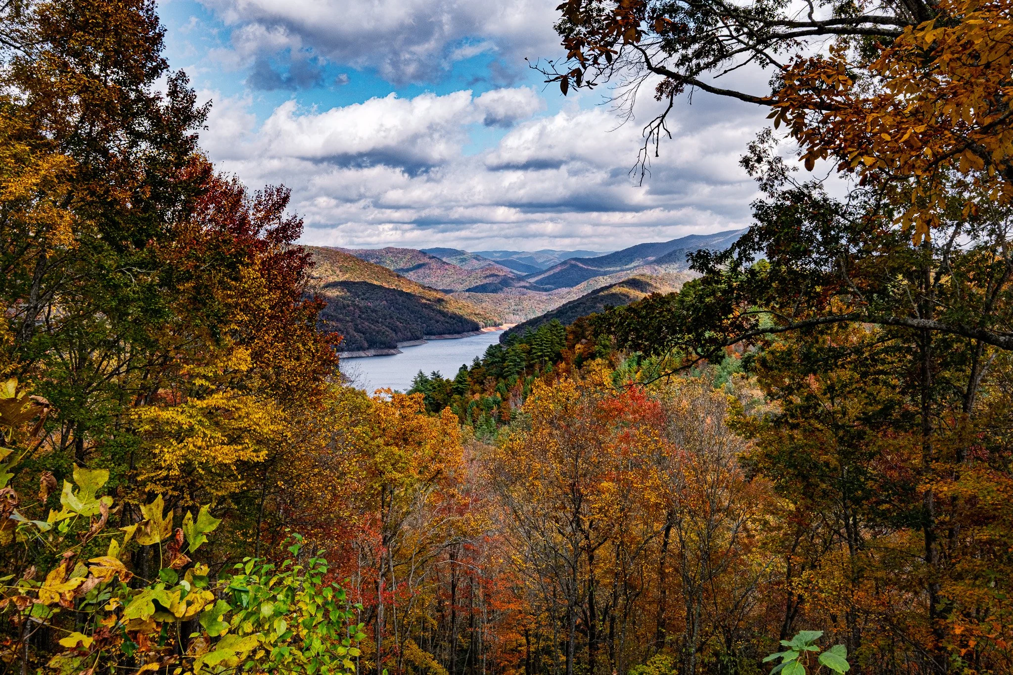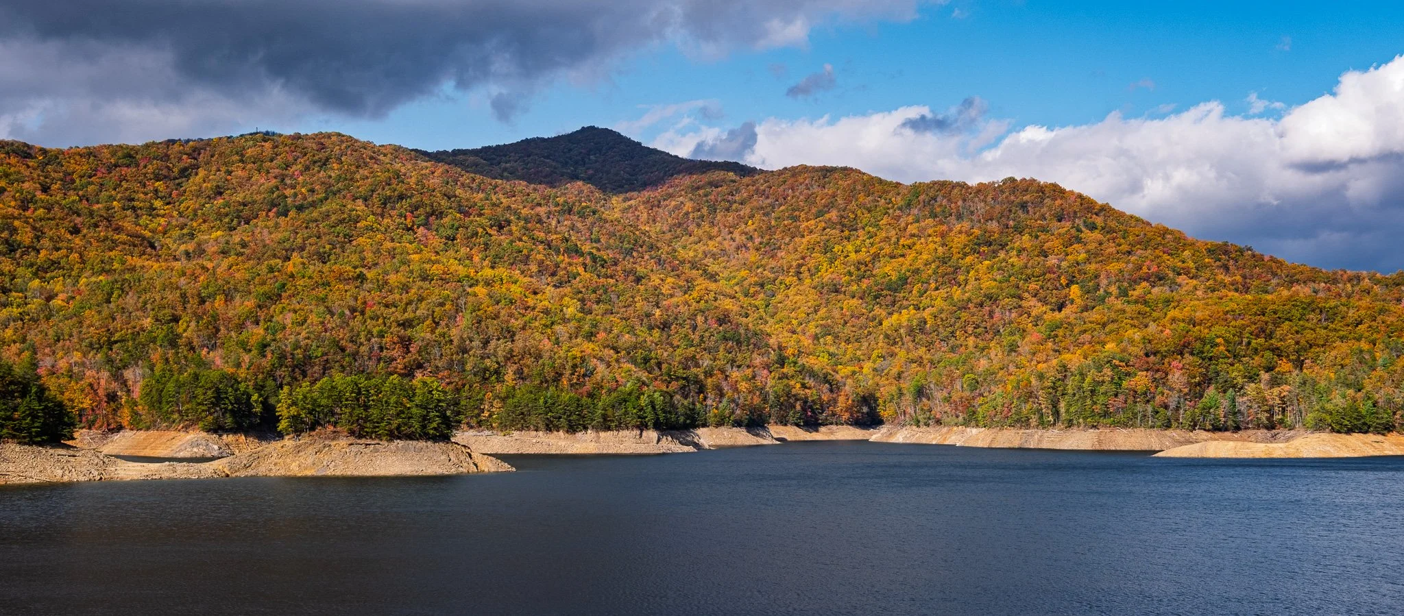 View from the top of Fontana Dam across Fontana Lake.