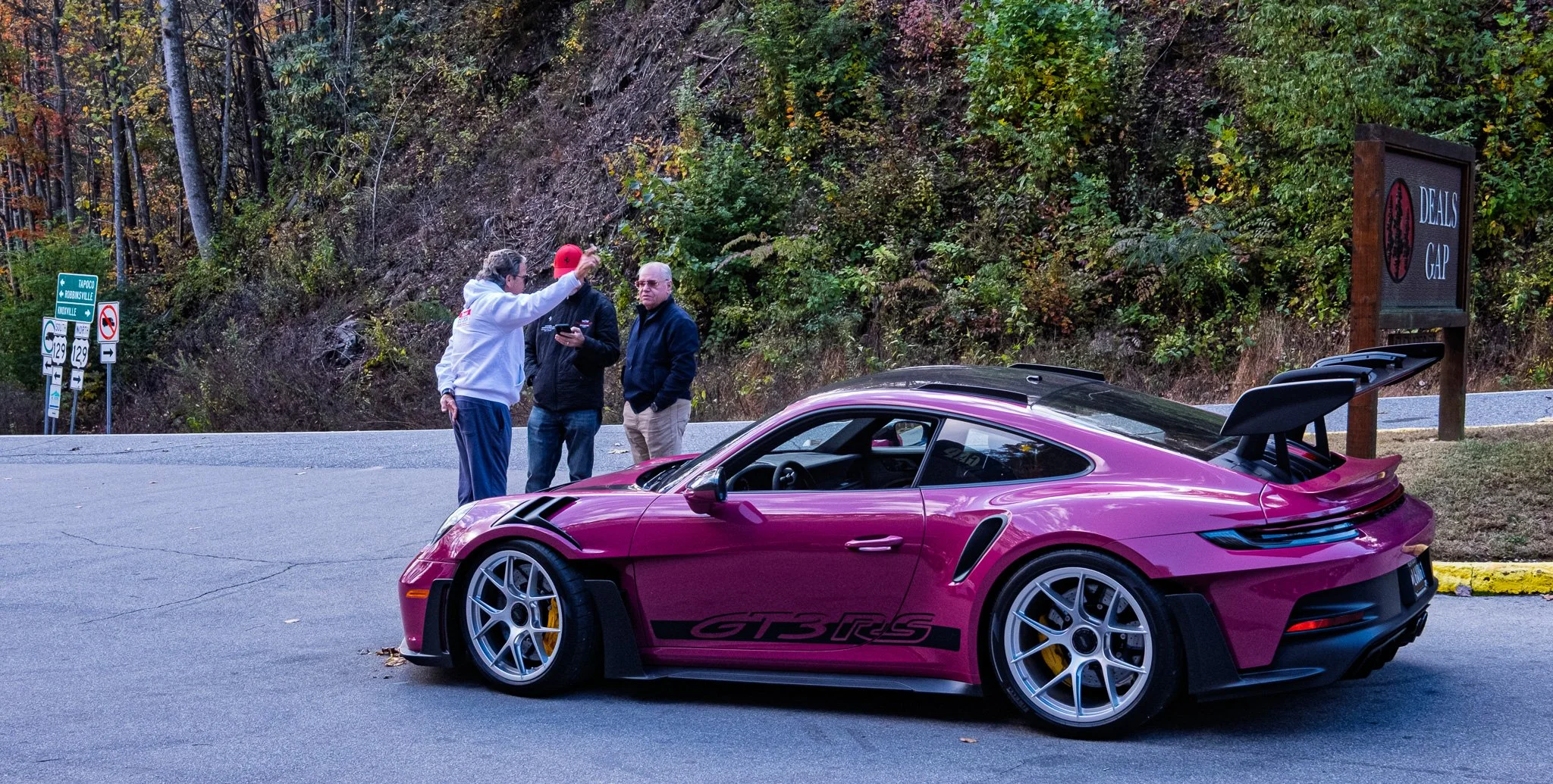 Look who we caught up with; stopped at Deals Gap. We had a nice visit with one of the guys as he fueled his Porsche Boxster Spyder. They were a group of friends, probably in their 60’s, who made the trip from KY with their cars to drive The Dragon and other fantastic driver’s roads in this area. Of all the wonderful cars in this group, this Porsche GT3 RS was by far my favorite!! The gentleman on the right - with his hands in his pockets - owned this one.