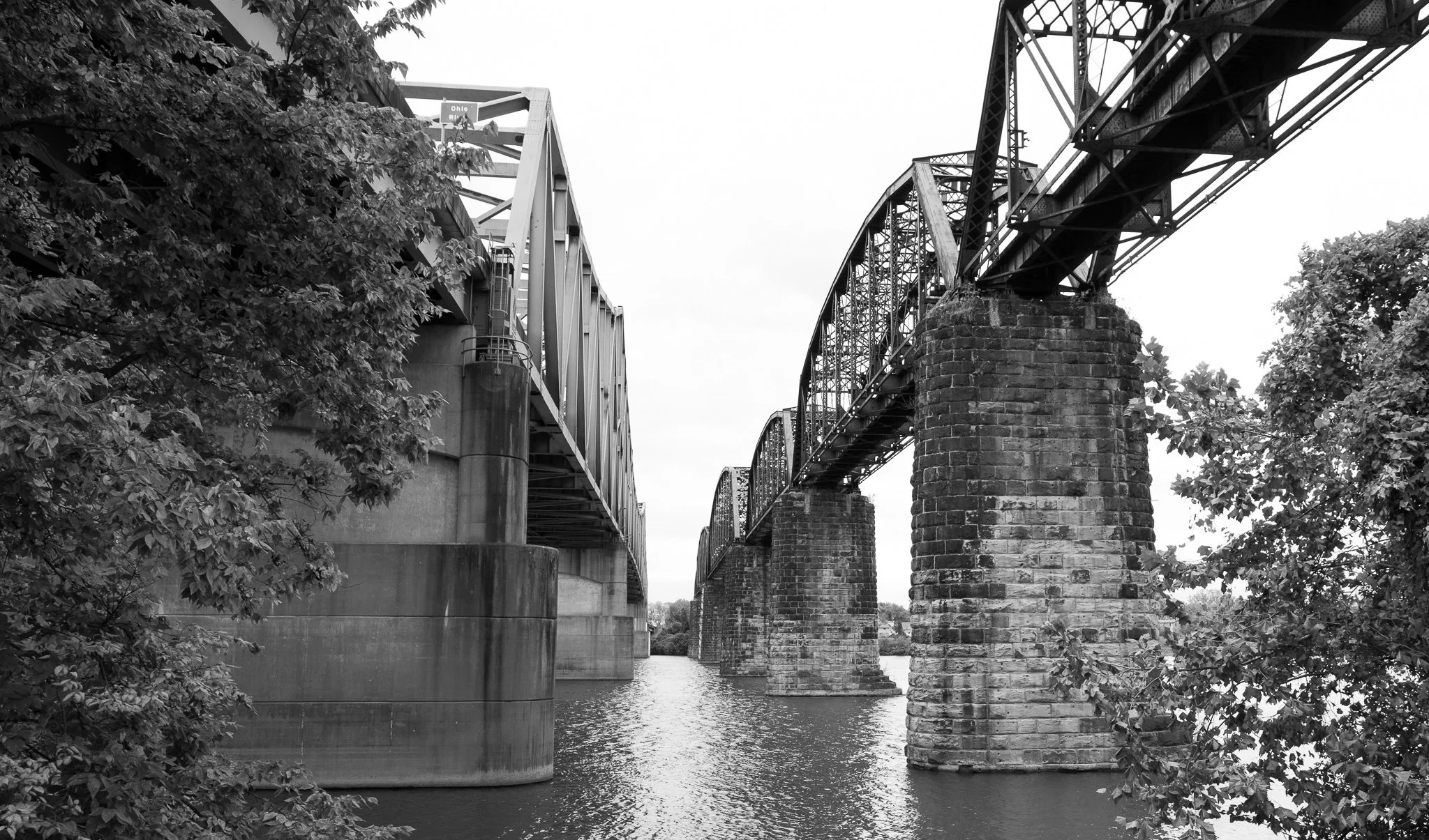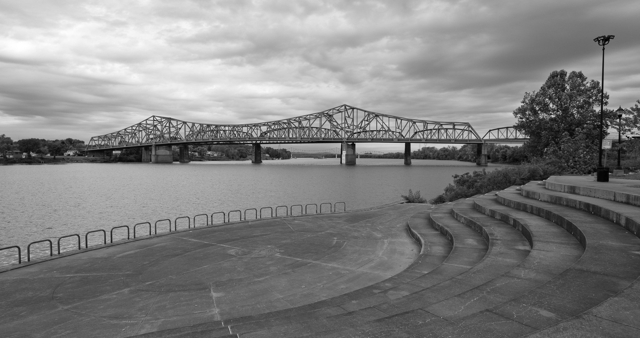 On the left is the Parkersburg-Belpre bridge for automobiles connecting Parkersburg, West Virginia with Belpre, Ohio. On the right is the Sixth Street Railroad Bridge.
