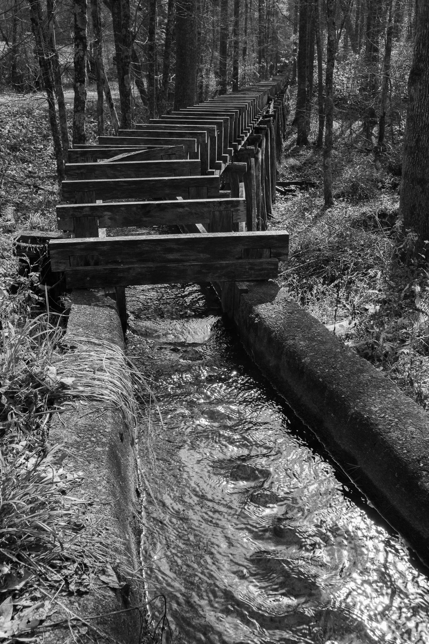 These structures are called millraces. When it’s made of wood and elevated, it’s often referred to as a wooden flume, but millrace is the general term. These extensive wooden flumes were made to direct river water onto the paddle wheel to run the mill.