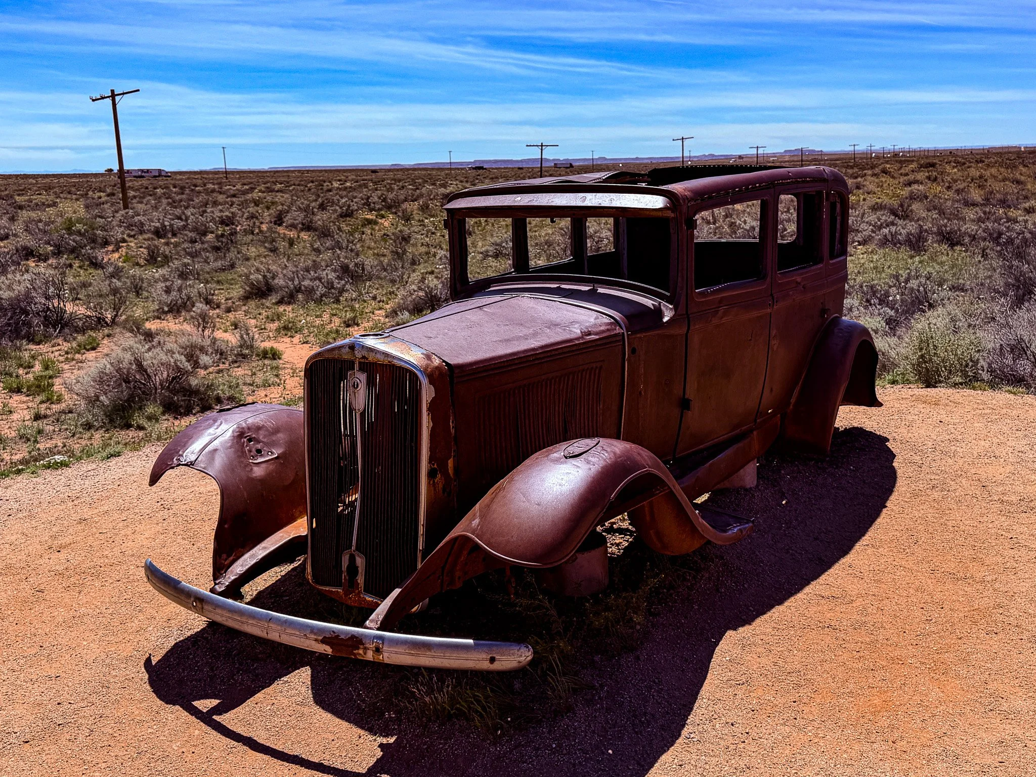 Just before you leave the north side of the park they have a 1932 Studebaker shell as a tribute to Route 66. Part of old Route 66 actually ran directly though the park at this location. The line of telephone poles behind the car mark the route as it would have been in the years a car like this would have driven it.