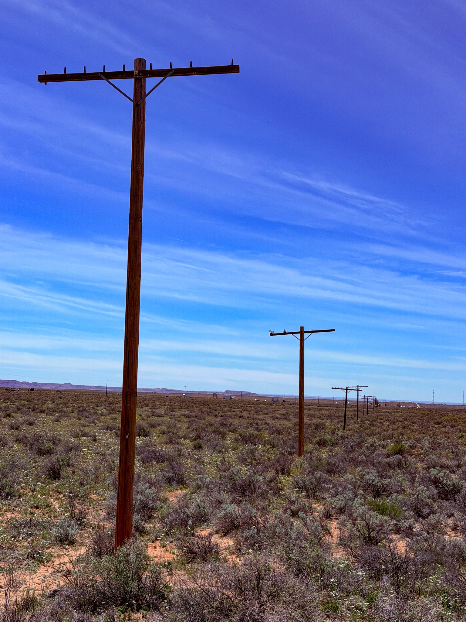 These are the telephone poles that once ran right along old Route 66 through this part of the desert. Although the road surface is long gone, the telephone poles still stand as testament to its long ago existance.