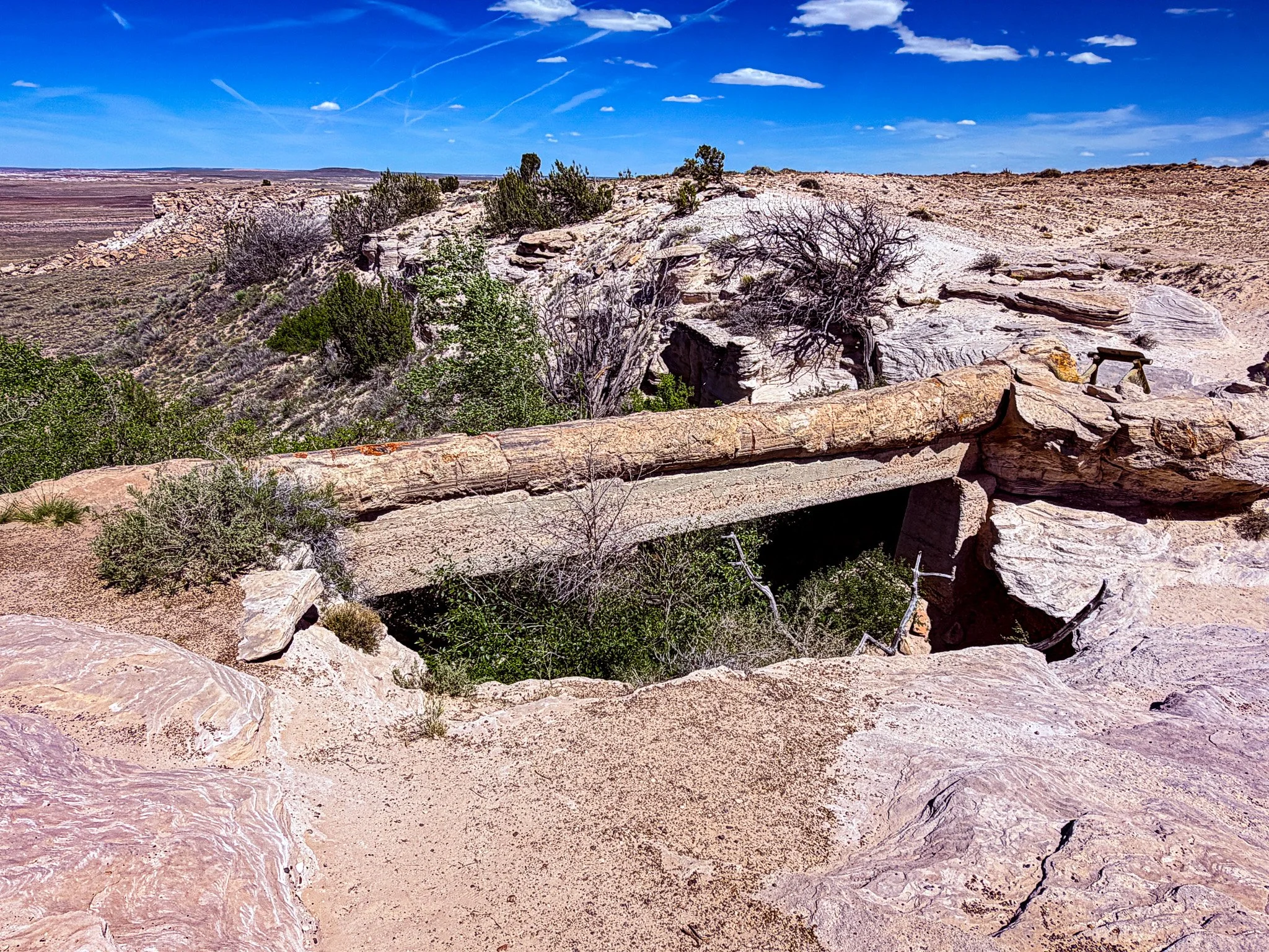 This is known as Agate Bridge; a petrified log that spans a desert wash. The structure below the log is a reinforcing beam that preservationists installed in hopes of preventing the log from one day crumbing into the wash below.