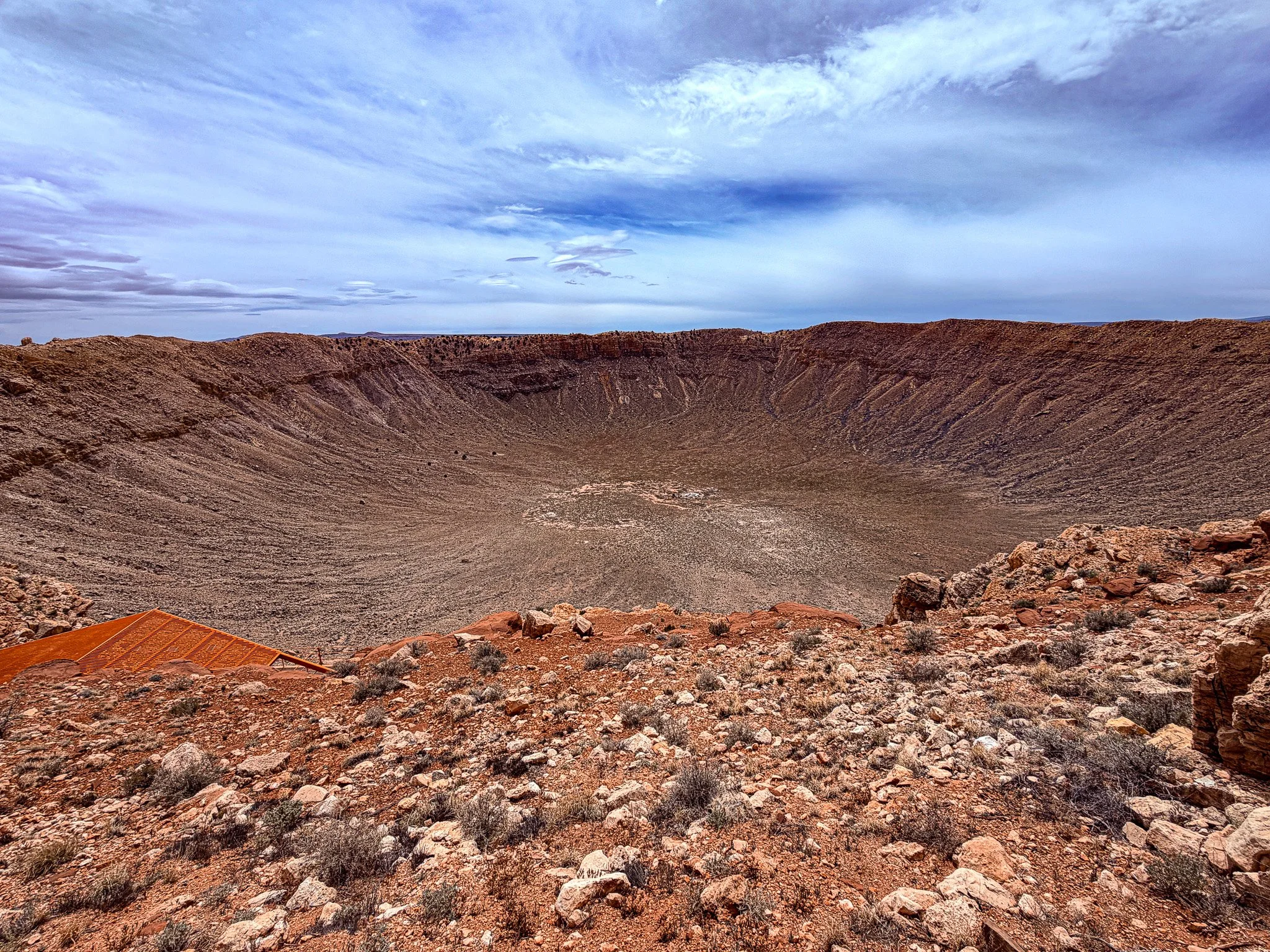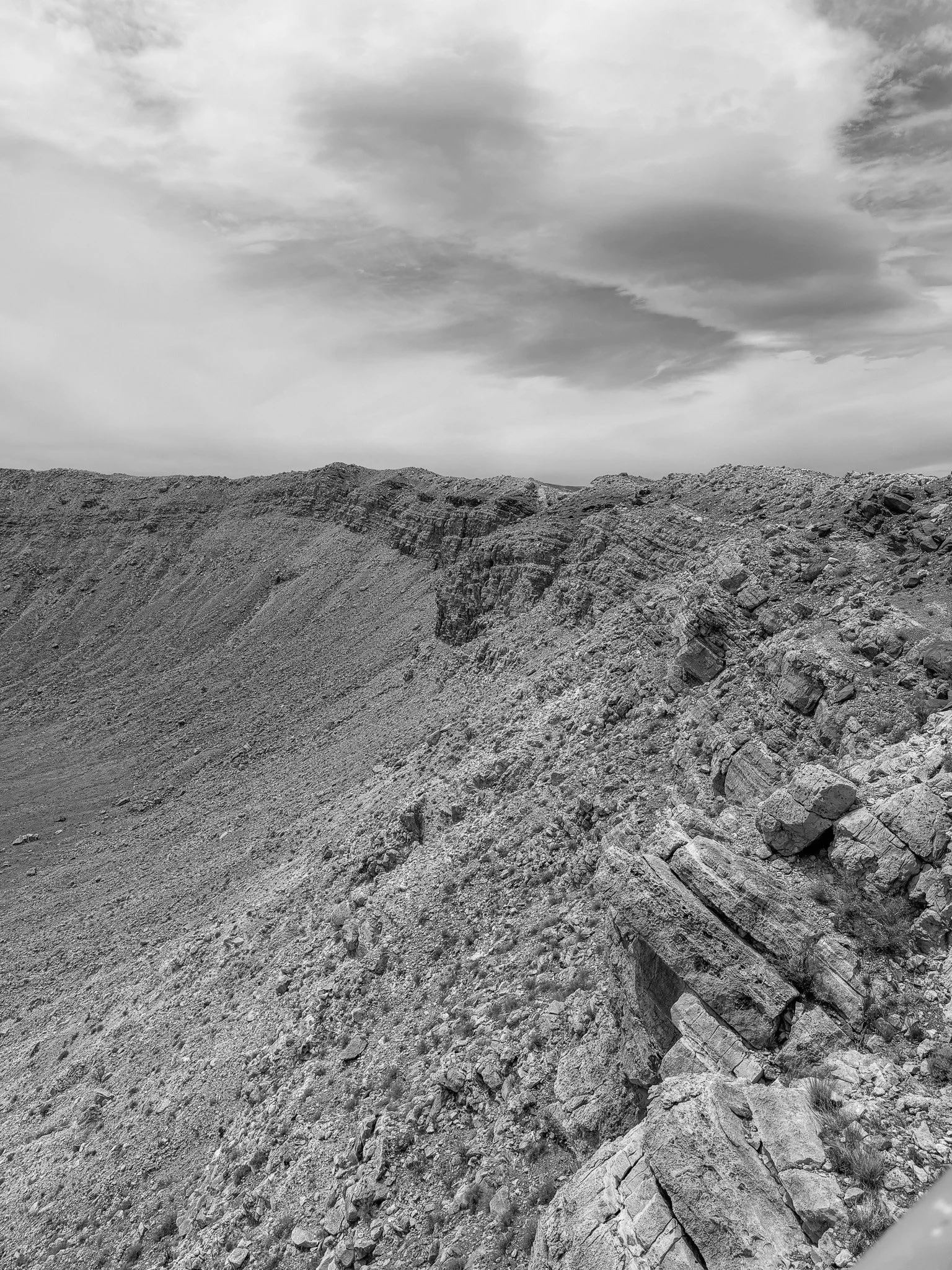 On the right side of this image, you can see how the cleavage lines in the rocks all orient in a slanted upward fashion. This pattern can be seen extending around the crater rim. This is what early scientists used to determine that this was in fact caused by a meteorite impact and not a volcanic eruption. The upward sloped rocks indicate upward blast from an object hitting in the center of the crater.