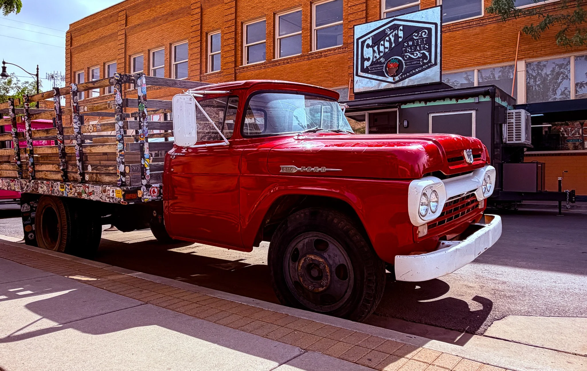 In addition to the reflection painted in the mural of the woman driving a flatbed Ford, they also have an actual flatbed Ford parked in this location.
