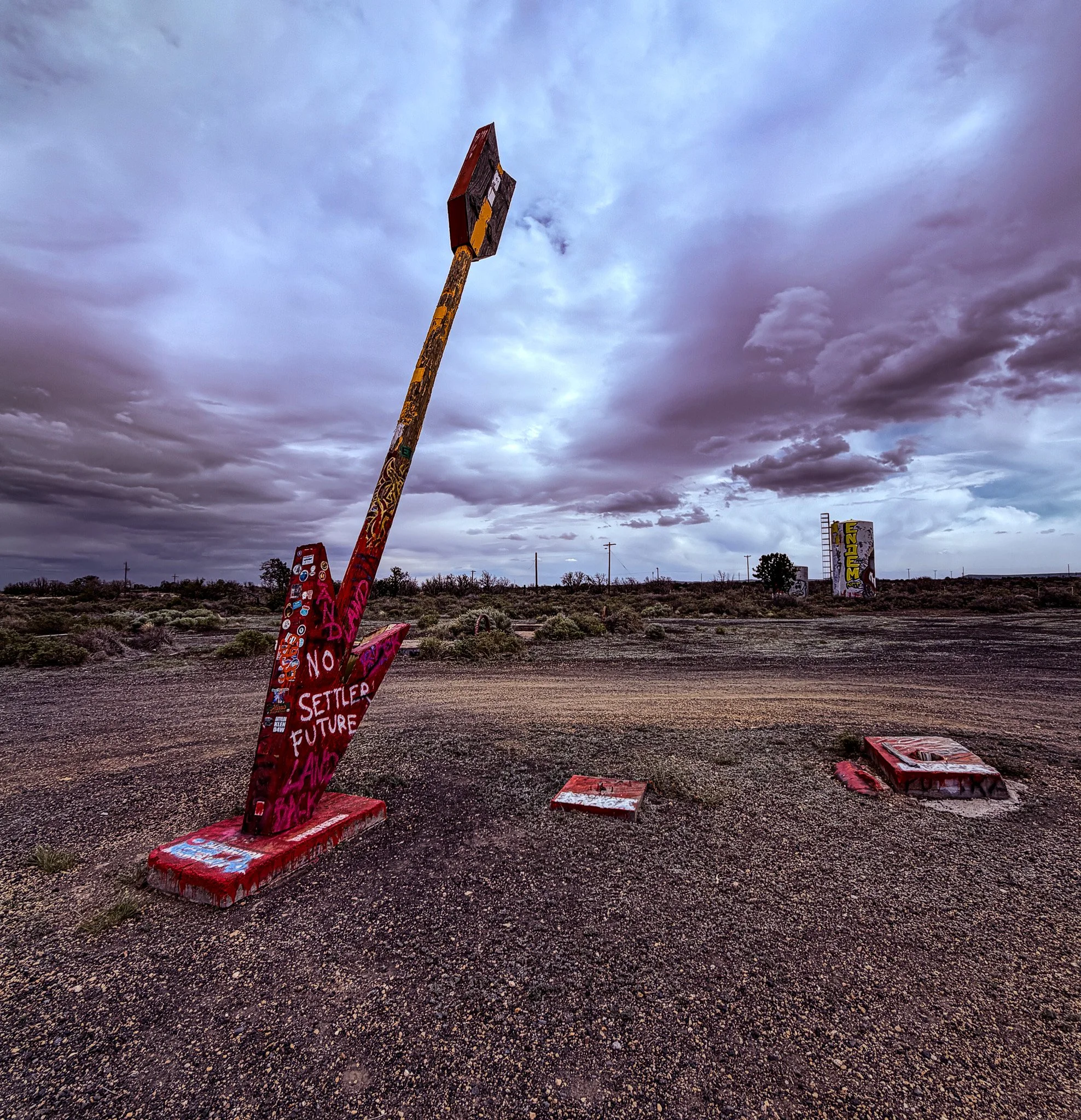 Just a little further west we find more abandoned ruins. This was the Twin Arrows Trading Post. Until just a few years ago there were two arrows here, but you can see that someone tore the other one from the base.