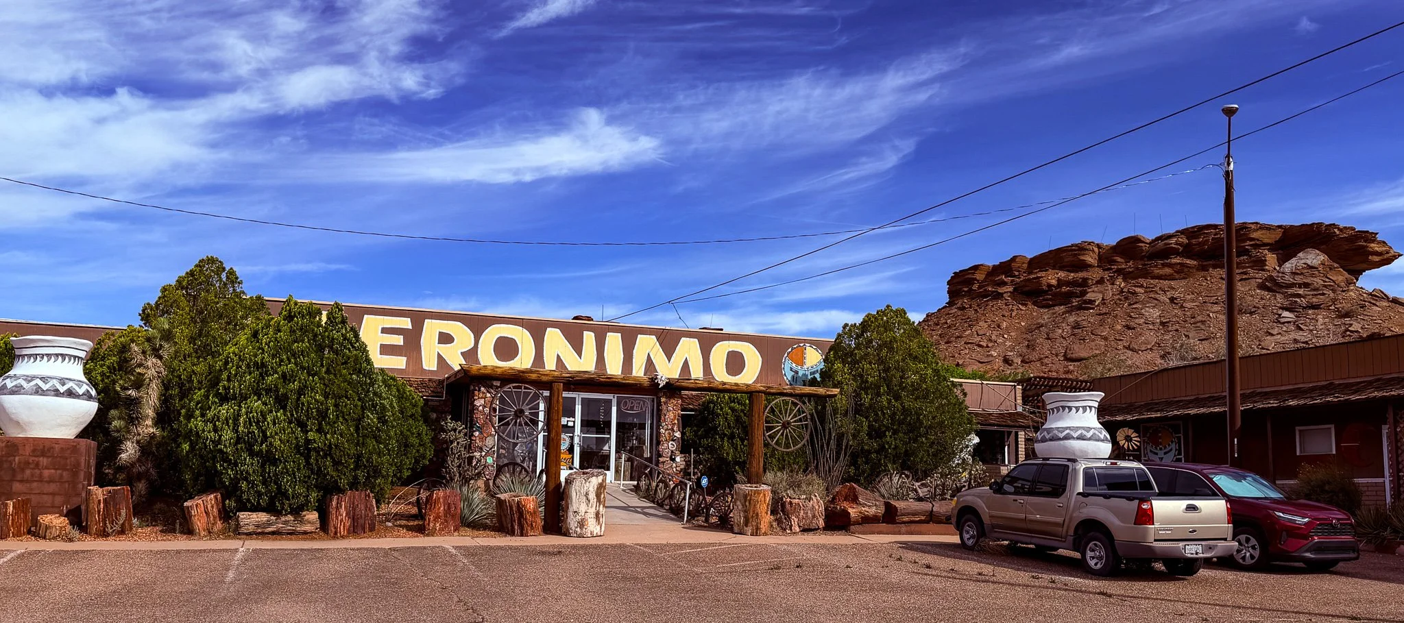 The Geronimo Trading Post is a classic Route 66 roadside attraction near Joseph City, Arizona, known for souvenirs and its “World’s Largest Petrified Tree.” Opened in 1974, it echoes the highway’s heyday, when quirky stops and bold advertising lured travelers along the Mother Road.