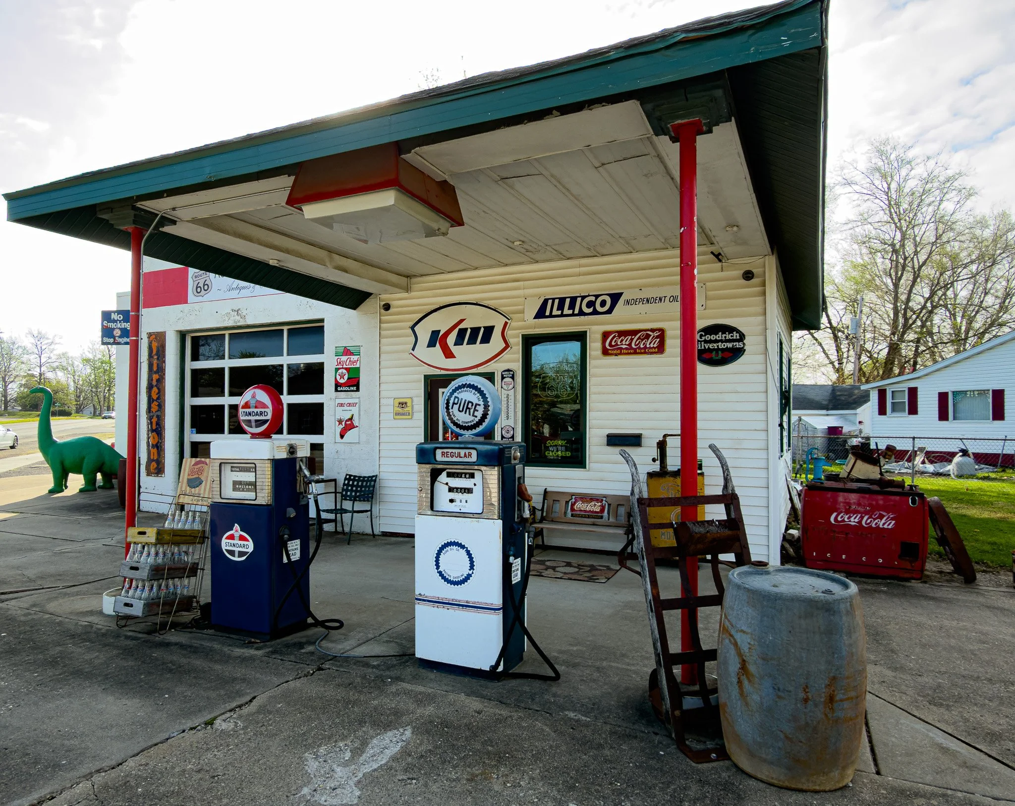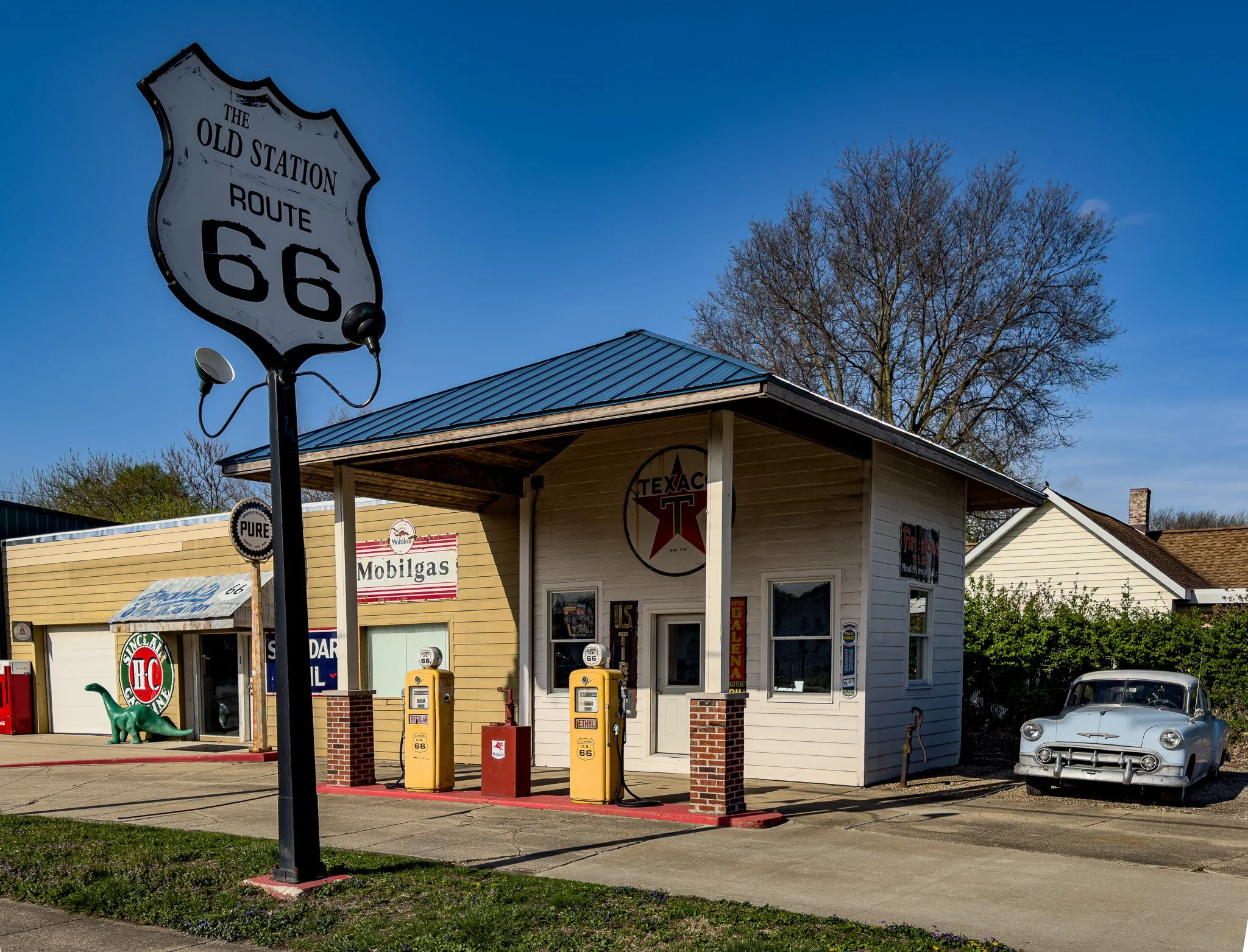 The Old Station in Williamsville, Illinois, is a restored 1930s Route 66 gas station that reflects the charm of early roadside travel. Located along the original alignment, it features vintage pumps and signage from brands like Texaco and Sinclair. Though no longer operating, it remains a popular photo stop and nostalgic reminder of Route 66’s heyday.