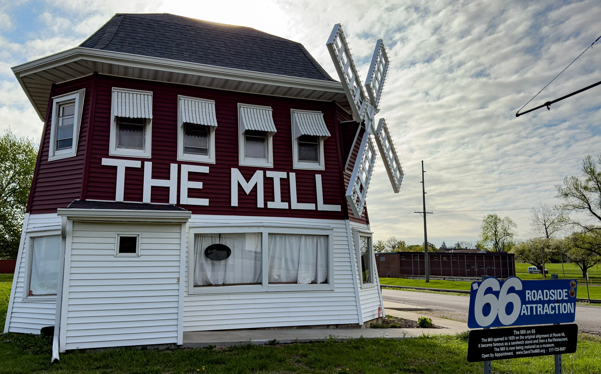 The Mill is a restored Route 66 landmark originally opened in 1929 as the Blue Mill restaurant and dance hall. Once a popular roadside gathering spot, it declined after Route 66 faded and closed in 1996. After extensive community restoration, it reopened in 2017 as a museum showcasing Route 66 history and memorabilia.