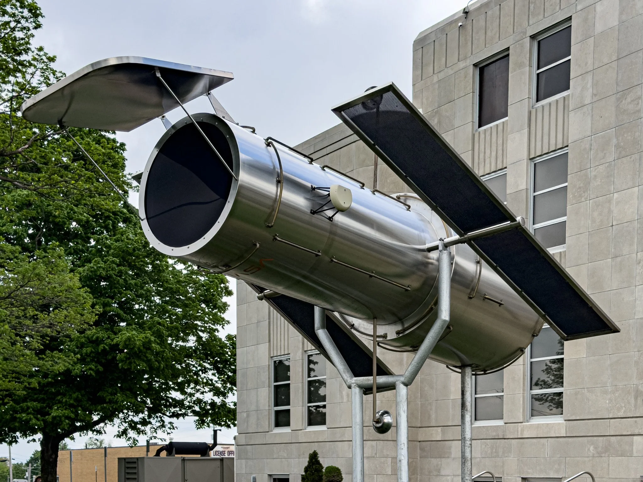 The model of the Hubble Space Telescope in Marshfield, MO is a one-quarter-scale replica honoring astronomer Edwin Hubble, who was born there. Installed near the courthouse, the roughly 1,200-pound structure is made of metal and mounted on a steel frame, appearing to float above the ground. Dedicated in the 1990s, it serves as a distinctive tribute to Hubble’s discoveries about galaxies and the expanding universe.