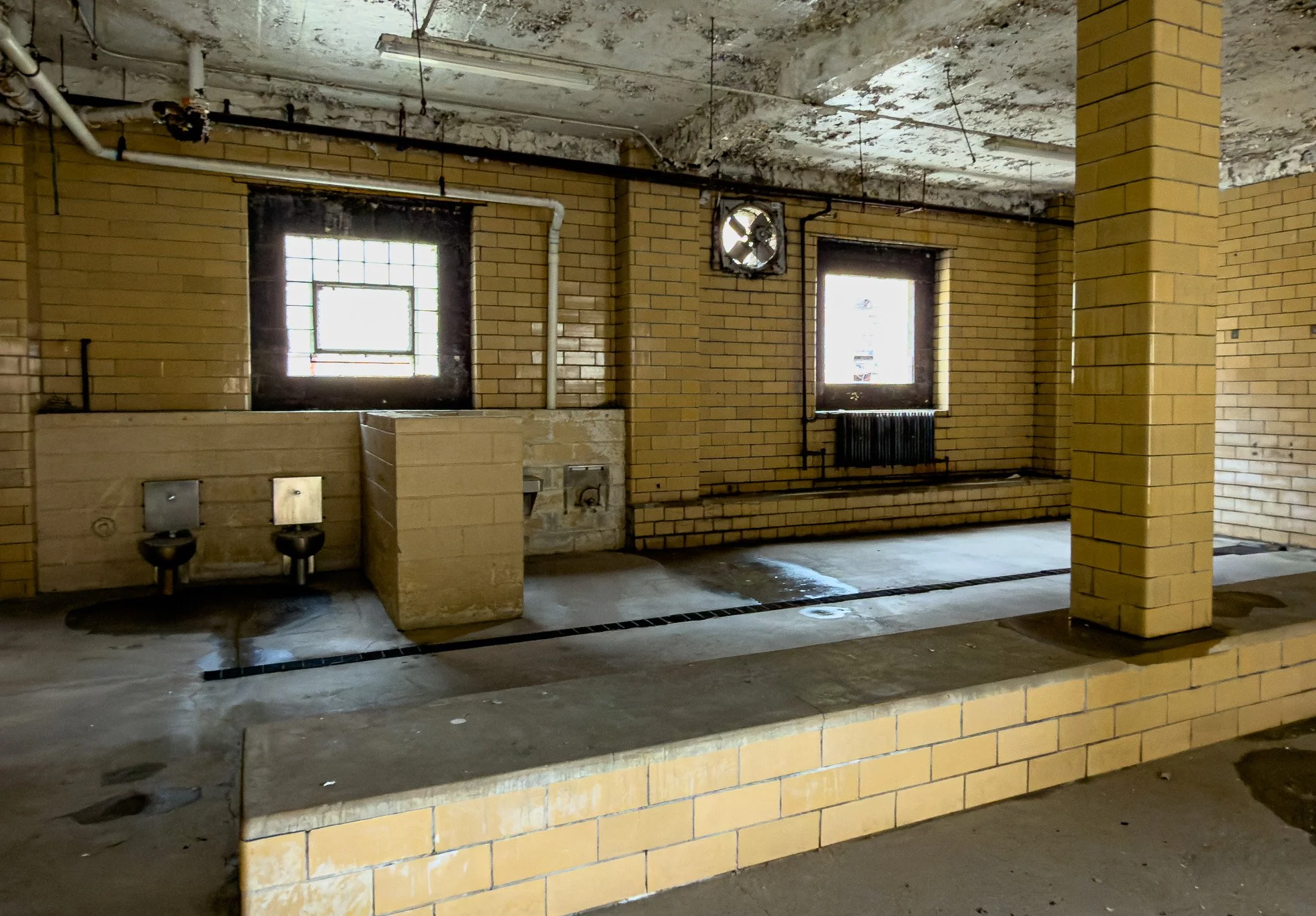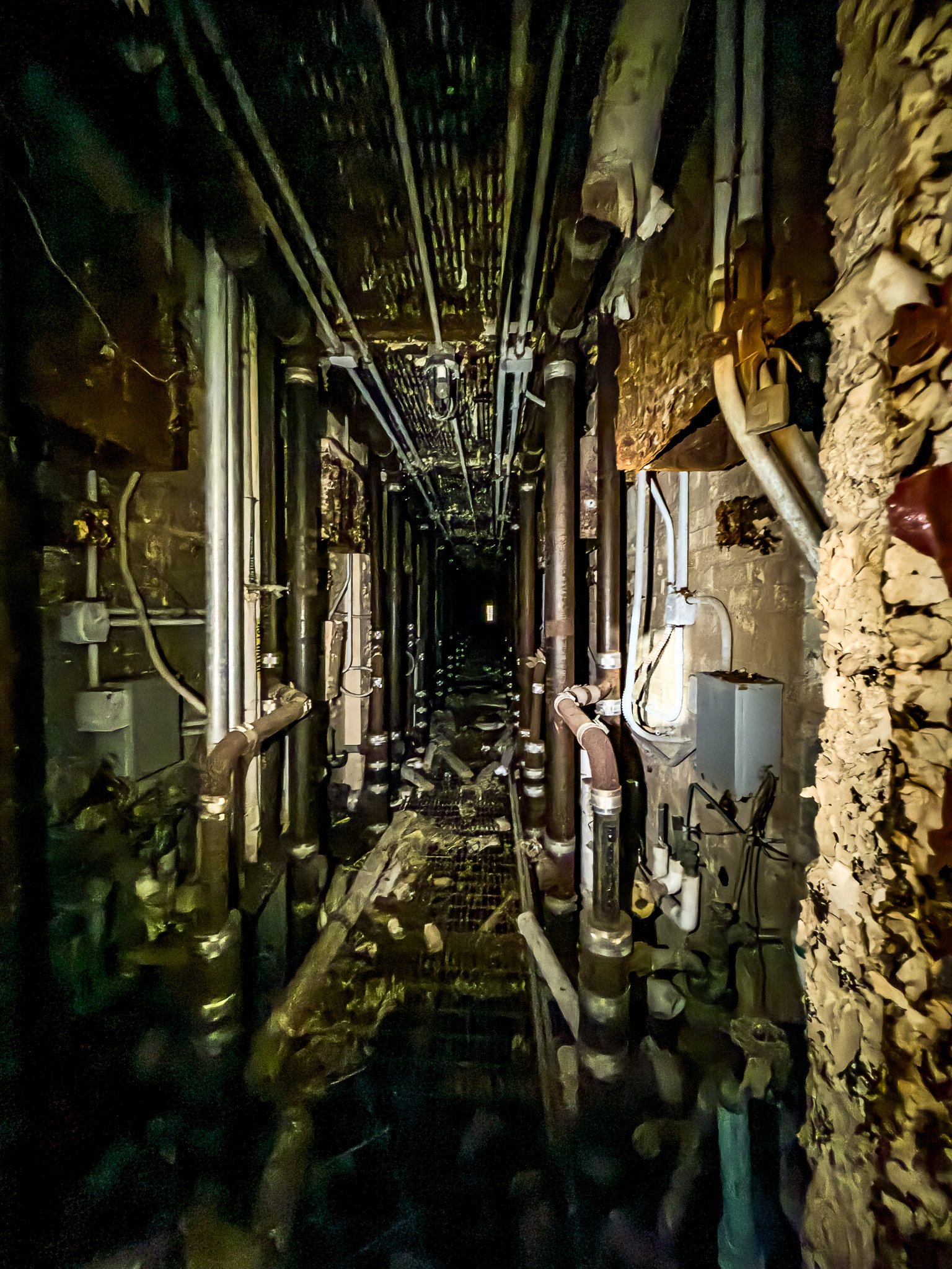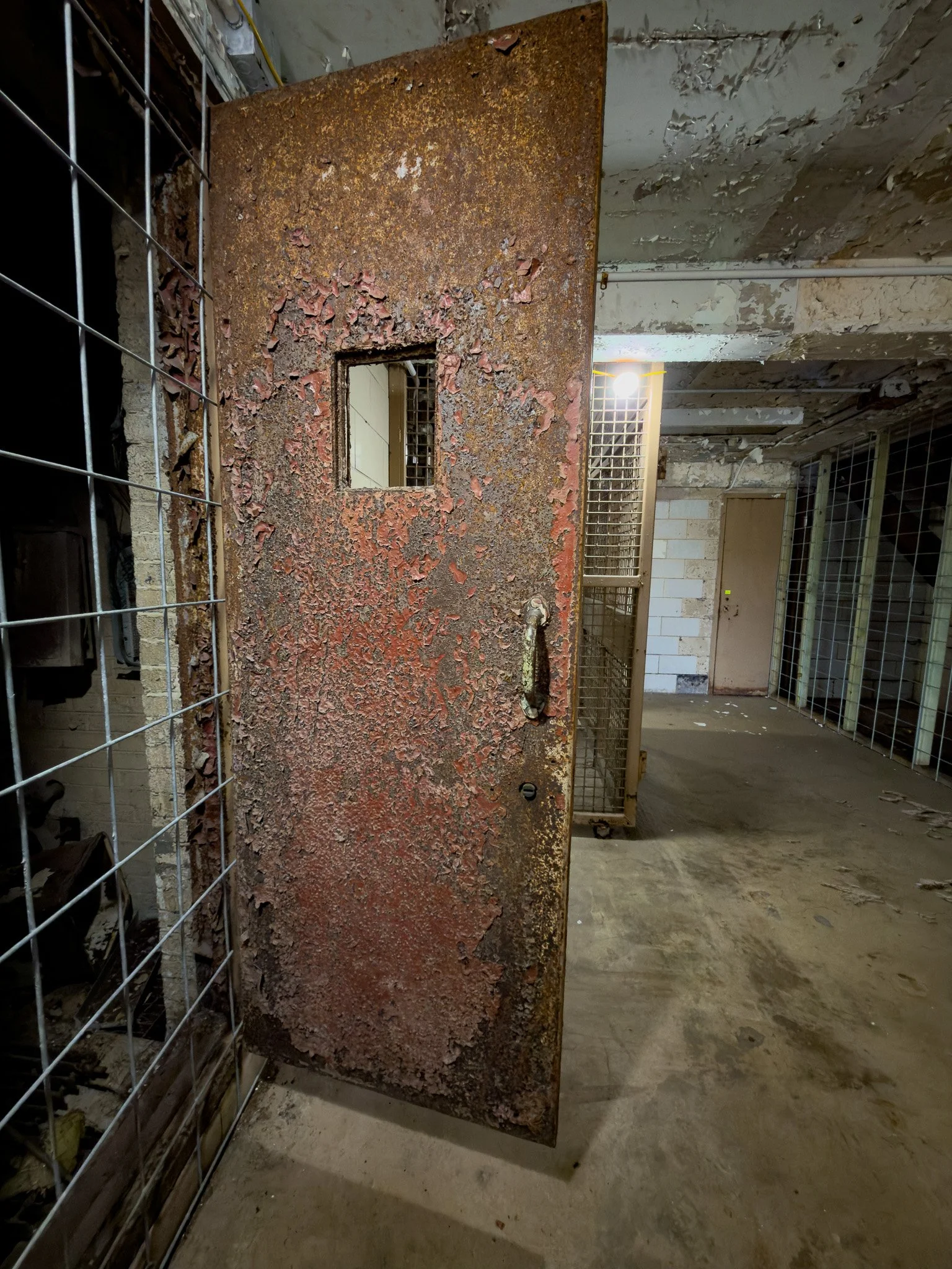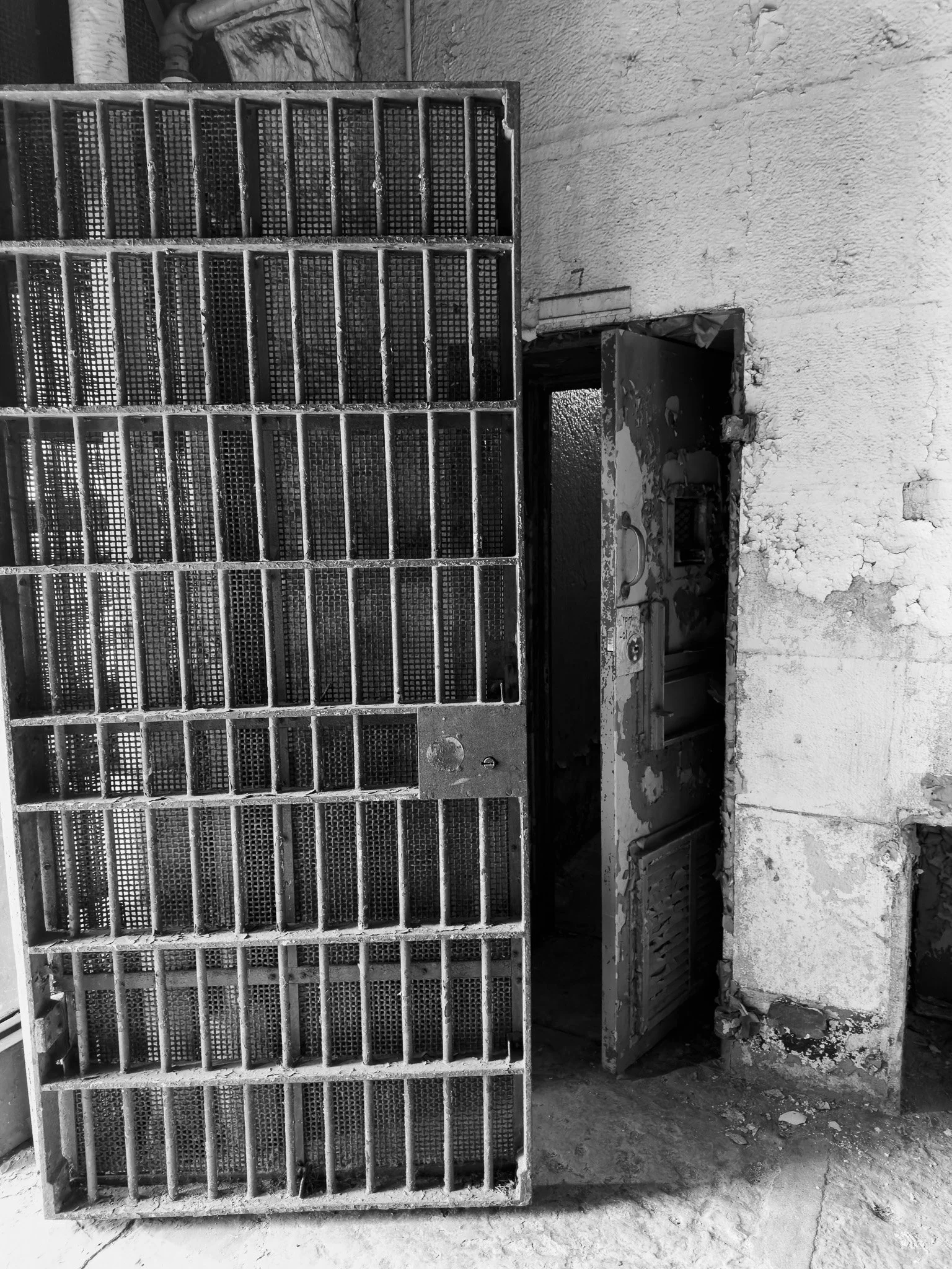 This is the central core that runs down the two sides of each row of cells. This is where the plumbing and electricity ran. It was into a core like this that inmates chiseled their way in infamous prison breaks such as Alcatraz and Dannemora, NY.